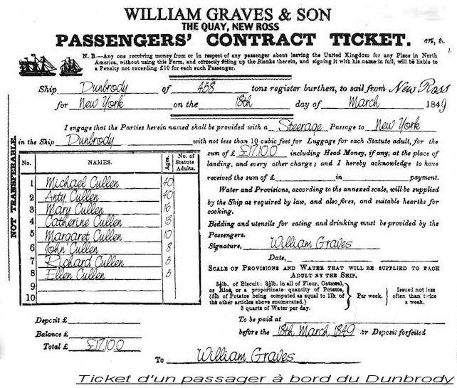 Les premiers étaient servis et nourris alors que les seconds devaient se faire à manger, voire s'en passer en ces années de disette. En 1847, la famine en Irlande était terrible! De nombreux bateaux proposaient le même service que le «Dunbrody Ship» ce qui engorgeait les ports. Le « Dunbrody Ship » a dû être mis en attente pendant 5 jours car la rivière St Lawrence était surchargée de navires. Cela eût des conséquences sur les passagers et membres d’équipage qui sont morts où qui ont bu l’eau polluée de la mer. Mais grâce au capitaine Baldwin le taux de mortalité est resté assez faible, sachant que les autres capitaines on perdu entre un tiers et la moitié de leurs passagers. En 1869, ce navire devient Anglais. En 1874, il s’échoue dans la rivière St Lawrence. En 1875, il est réparé et remis à flots pour finir la même année, par refaire naufrage.